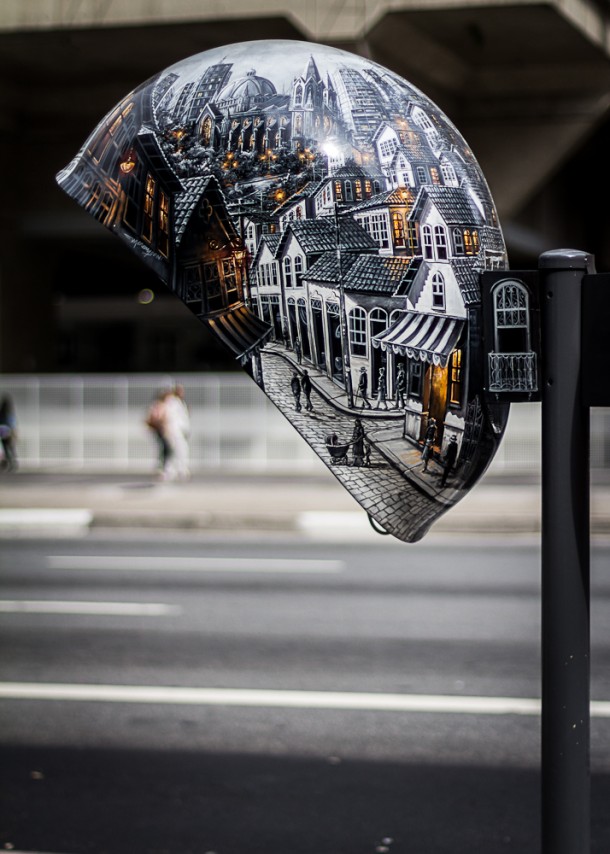 Here, 100 artists were given with a set of phone booth hood to paint on. Free theme, free canvas, free reign to transform the peculiar hooded fixtures into anything imaginable.