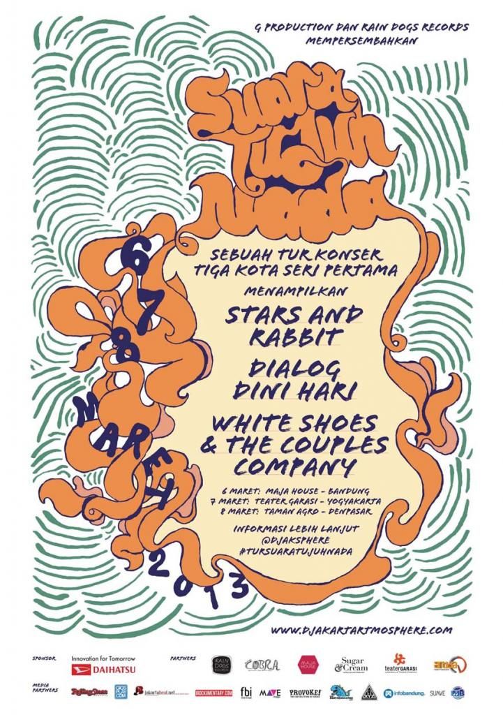 You probably have read from Djakartamosphere’s twitter page that the tickets are selling fast or even worst have been sold out less than 2 days after their announcement about the events, but for those who haven’t heard about it, this what you’ve missed about; G Production collaborating with Rain Dogs Records, are making music concert concept tour for these three talented local Indonesian bands, Starts and Rabbit, Dialog Dini Hari, and White Shoes and The Couples Company, in three days, at three different cities. The tour itself will start from Bandung on March 6th, 2013 at Maja House, continue on the next day at Teater Garasi at Yogyakarta, and ended Taman Argo Bali on Macrh 6th, 2013. So if you really want to catch their live performance, you better make your reservation in a rush before its too late!