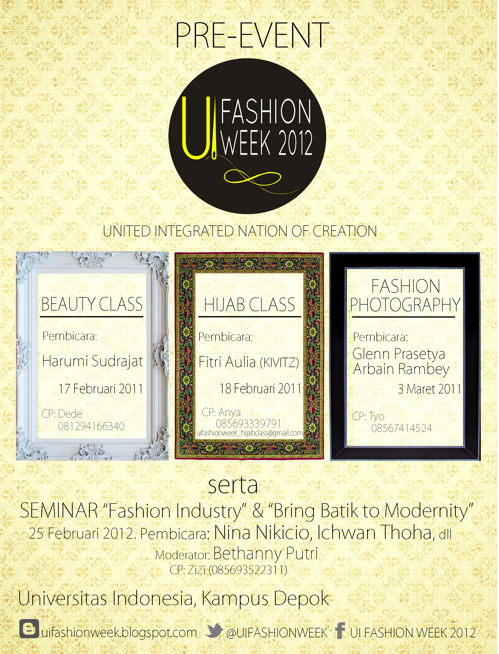 UI Fashion Week is an event which held by students from each faculty in University of Indonesia who have passion for fashion. As a place for young fashion creativeprenenur to increase their talent, the event gain full support from DKIB UI (Direktorat Kemitraan dan Inkubator Bisnis) and have been planned to be one of UI’s annual events.  UI Fashion Week is devided into two main programs, the pre-event and event’s day. Bellow are the schedules, which you are welcome to join and participate on one of it