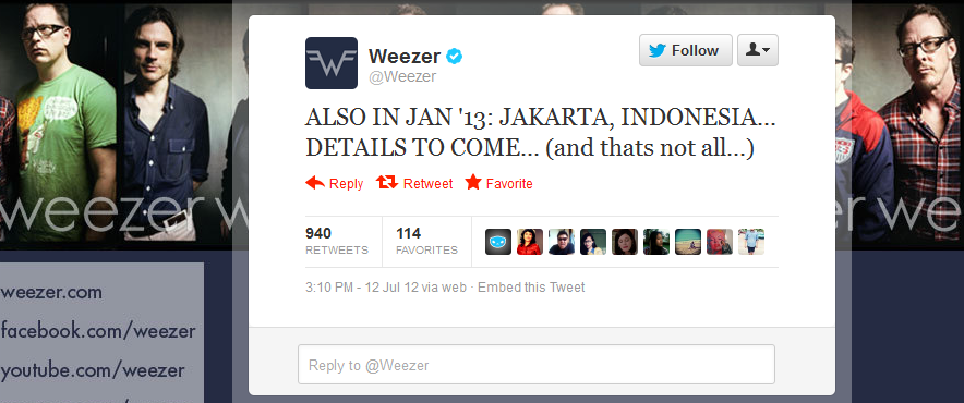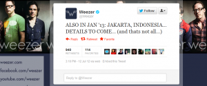 As some hints were being spreaded on Rivers Cuomo’s account on Facebook saying “JAKARTA”, the fans of Weezer started questioning about the meaning of his post. And then, in July 2012, Weezer official twitter account tweeted: